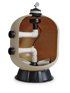 El filtro utiliza arena de filtrado para remover particulares de tierra del agua, la suciedad es atrapada en el filtro por la cama de arena cuando el agua pasa por el filtro, el agua entra en el filtro por la válvula de arriba del filtro y es distribuida para abajo de la cama de arena igualmente, la suciedad es removida por la arena y el agua limpia corre por la tubería en la parte de abajo del filtro, para arriba de la tubería central y de regreso para la válvula de arriba del filtro, donde el agua limpia es regresada a la piscina por los caños.